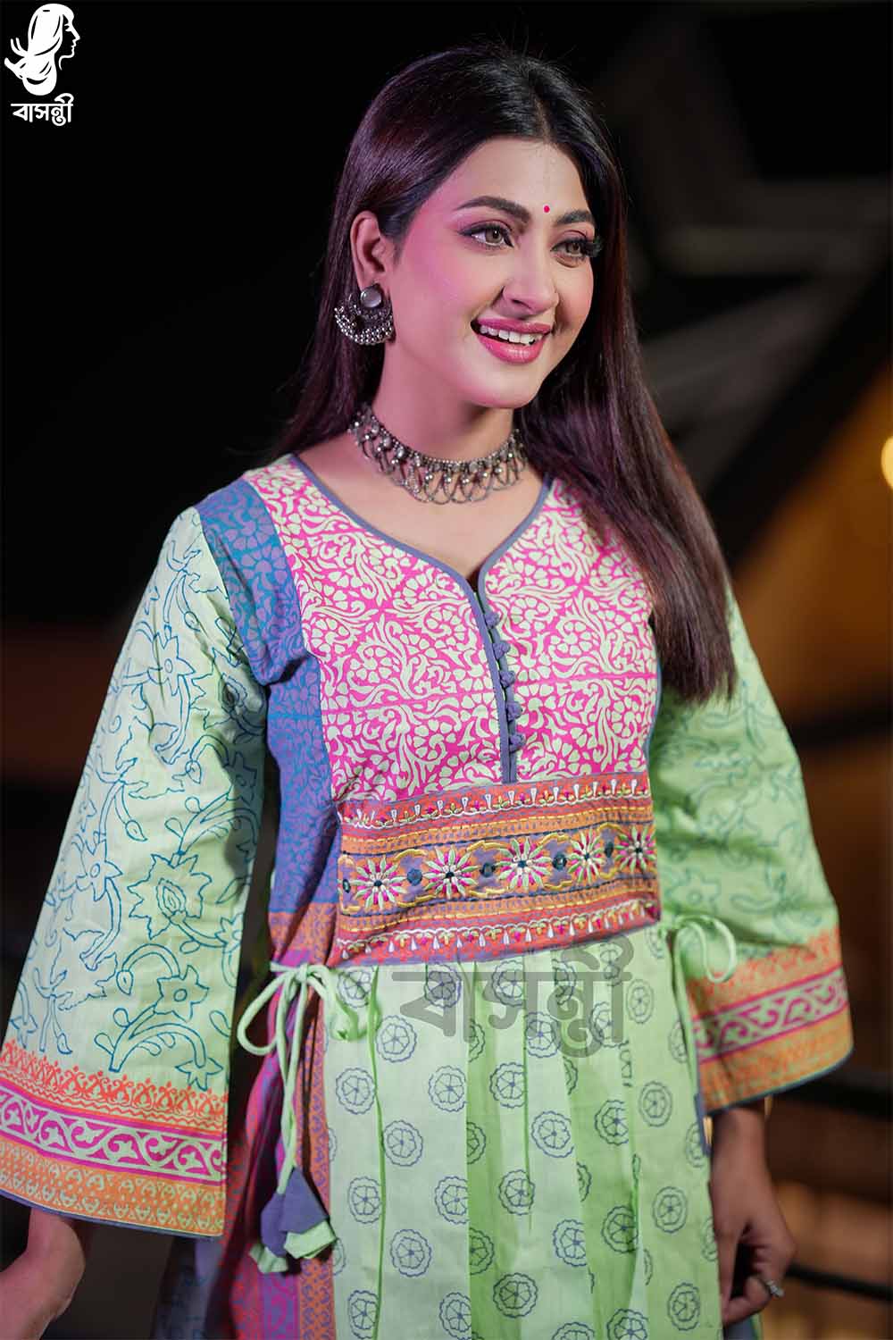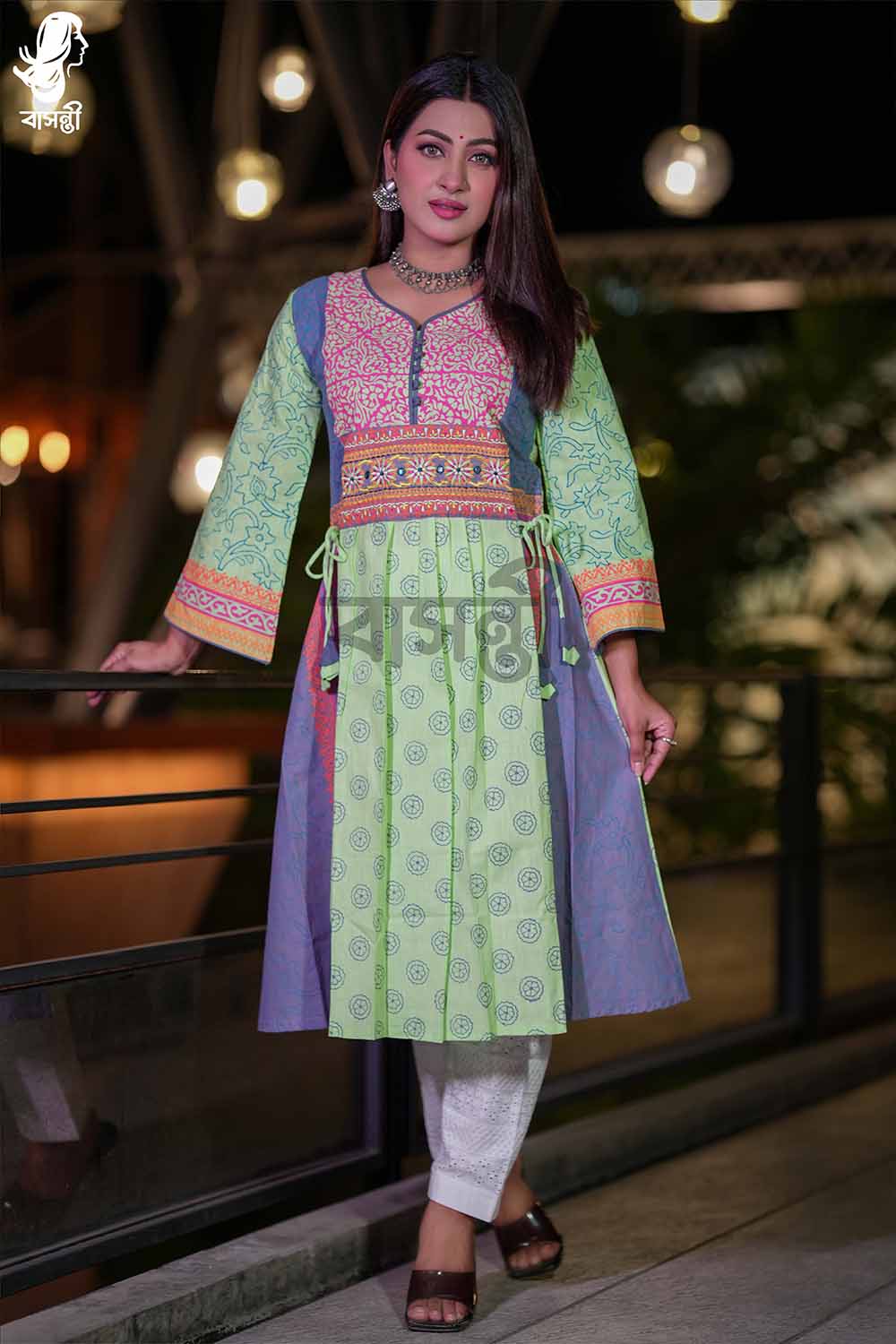 পিওর আড়ং সুতি কটন কাপড় দিয়ে তৈরি এই কুর্তিগুলোতে রয়েছে হ্যান্ড ব্লক ও ম্যানুয়াল এমব্রয়ডারি কাজ। প্রিমিয়াম কোয়ালিটির ফেব্রিক এবং যত্নশীল সেলাই আপনাকে দেবে আরামদায়ক ও পরিপাটি লুক।